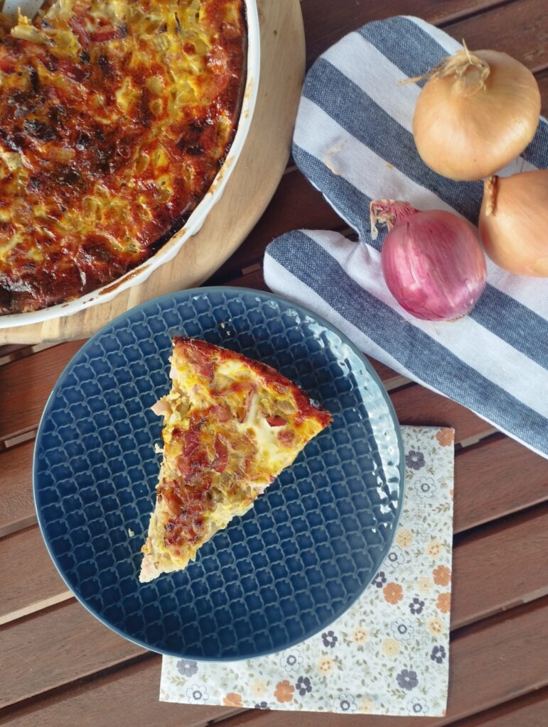 Aus Mehl, kalter Butter, Salz und Eiswasser einen Mürbeteig kneten. Ca. 30 Minuten kalt stellen. Die Zwiebeln schälen, halbieren und in Scheiben schneiden.